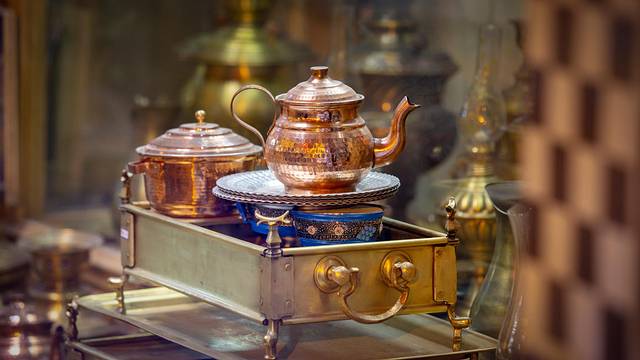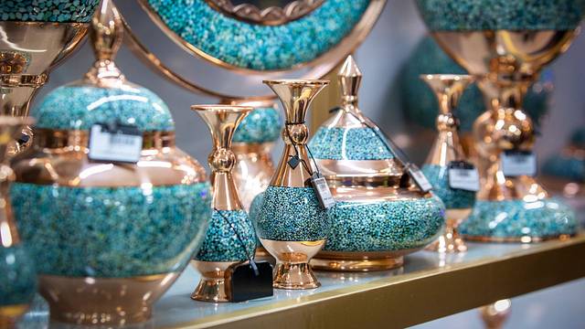 第四,青铜工艺品。前面说到过,伊朗是个手工艺非常发达的国家。估计全世界不进口中国小商品的国家不多,但是伊朗肯定是一个。伊朗的青铜工艺品还是很不错的,包括盘子,首饰盒,还有一些瓶瓶罐罐的,有些上面镶满了绿松石,非常好看。
