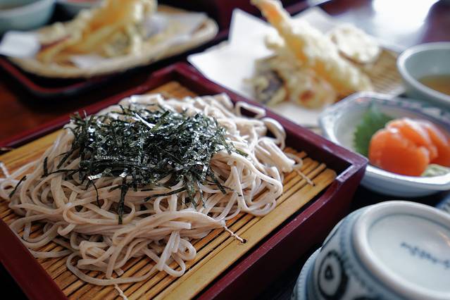 荞麦庄的荞麦面是店家自家磨制,香气浓郁的二八荞麦面,点一份最恰到好处的“名城荞麦套餐”,正宗的信州荞麦面、炸的酥脆的天妇罗、还有生鱼片、牛肝菌等等……吃的饱饱的,满足地逛松本城。