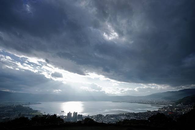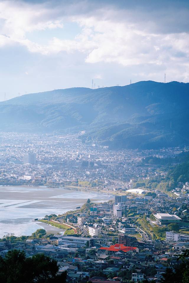 欣赏诹访湖的最佳位置为距离市中心东北约1.5公里的山腹上的立石公园。站在立石公园,眼前烟波浩渺的诹访湖,极目远眺还可以看到罔谷市和下诹访町。如果是万里晴空,中部地区最著名的北阿尔卑斯山也可以看的真切。而天空乌云密布的时候,真的是有一种走进了“你的名字”的场景中的感觉。