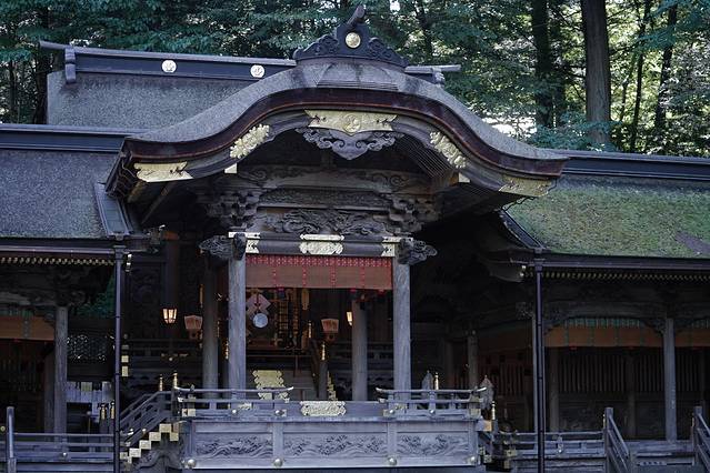社殿的四角矗立着形状独特的木柱,被叫做“御柱”。在申年与寅年会举办六年一次的御柱祭,是广为人知的日本三大奇祭之一。男性抱着柱子快速从山坡滑落下来的“木落”是最精彩的部分。