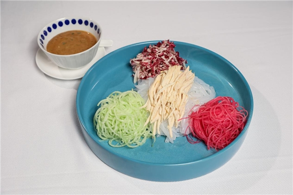 将鸡丝粉皮结合南洋风味,变奏一道满载祝福的冷盘 — 将丰富脆口的食材淋上酱汁并均匀搅拌,然后迅速捞起,是新加坡独特的新年庆祝方式,寓意“捞个风生水起”,而且要越捞越高,步步高升。