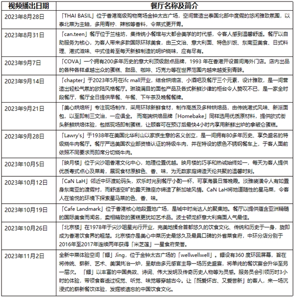 《纯味香港》系列短片以位于香港热门旅游区及核心区的餐厅为主打,涵盖了粤菜、西餐、东南亚料理、快餐和烘焙甜点等菜式,当中包括: