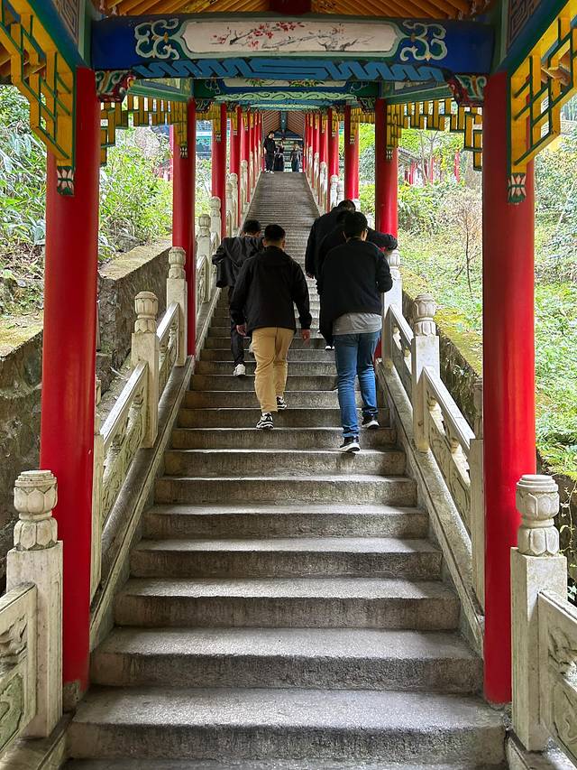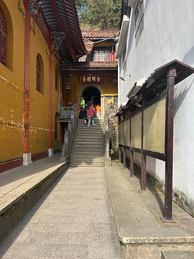 绕过地藏禅寺”大殿后,发现山坡上有一左一右两座长长的人行登山廊道,向下一直行走,顺着廊道走到尽头,便到九华街。