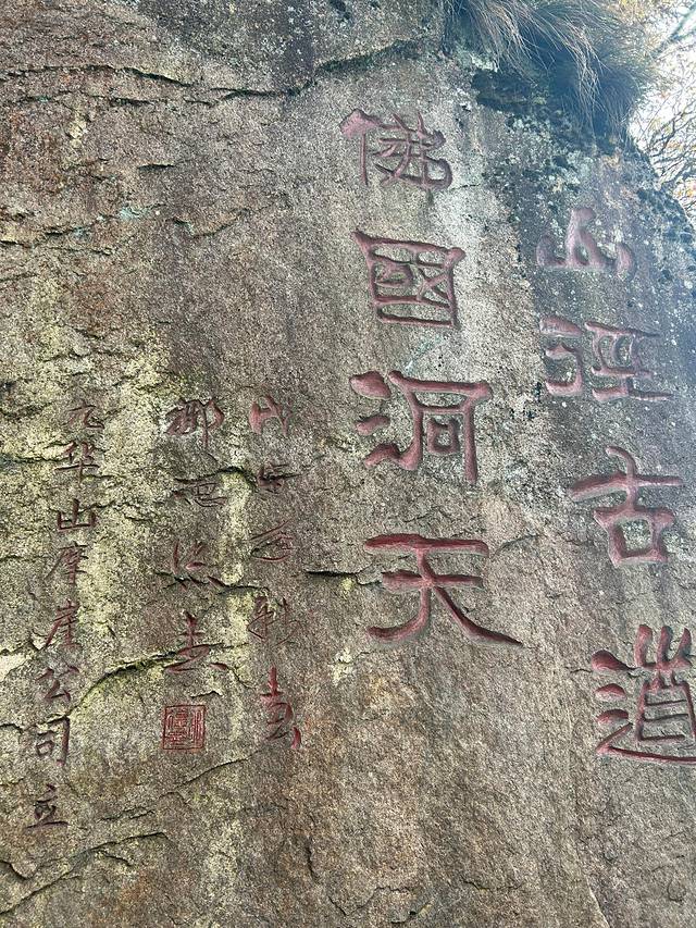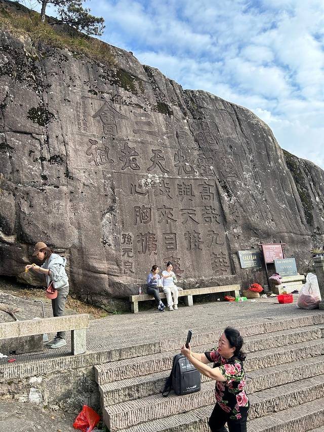 周围的岩石,奇形怪状,多呈黝黑色。有一巨石上刻“非人间”三字。此时此刻,真使人有身临蓬菜仙境之感。在天台上看日出,据说其瑰丽景色不亚于在泰山日观峰看日出。因此“天台晓日”被列为“九华十景”之一。