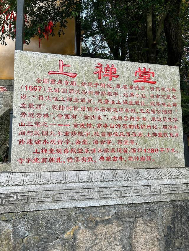 上禅堂邻近肉身宝殿南门,从神光岭路沿台阶上行3分钟即到。上禅堂始建于清代,全国重点寺院。上禅堂的建筑富有特色,是同期古建筑里保护的最有价值的,大殿的佛像采用传承千年的生漆夹纻工艺制作,为珍贵文物。九华山最有历史的滴水观音位于上禅堂,上禅堂也有“小普陀”之称,这里风景绝佳,还是86版《西游记》取景地。上禅堂住持果卓法师为人谦和,佛学造诣深厚,多年来投身公益慈善,令人赞叹。