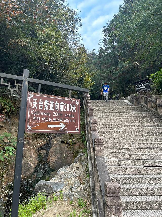 乘坐天台索道,全程10分钟左右,出站即是古拜经台。到了之后还需走1200多台阶才能到 达山顶。
