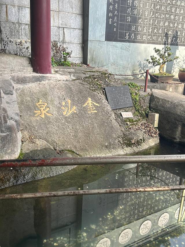 其泉清澈见底、金沙剔亮、四时不竭、如游龙出洞。入口则沁人心脾;擦洗则耳聪目明。其泉岩石上镌有“金沙泉”三个大字,相传为唐诗人李白手书。字体肥厚,笔力遒劲,结构和神韵,近似颜真卿,李白楷书遗墨不多,无从考证。诗曰:“神光岭上上禅堂,静雅幽奇古画廊,最是题泉唐李白,金沙千载字犹香。”泉边有金钱树一株,为九华山三宝(金钱树、娃娃鱼、叮当鸟)之一。这里同时也是拍摄86版西游记《误入小雷音》的取景地,