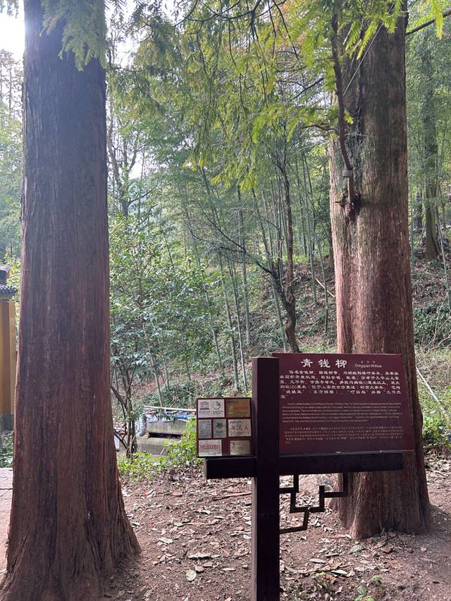 青钱柳 Cyclocarya paliurus Iljinskaja别称:摇钱树、麻柳 第三纪古热带区系的孑遗树种之一。九华山从甘露寺到闵园共有12棵,其中以金沙泉旁一株连理树最大,树高30余米,胸径0.7米。该树春天长绿色花瓣,瓣呈一圆形膜,瓣瓣相连,似一串串铜钱。秋季花瓣呈金黄色,秋风萧瑟,树根四周落满金灿灿的“钱币”。被列为九华山“三宝”之一(金钱树、娃娃鱼、叮当鸟)。