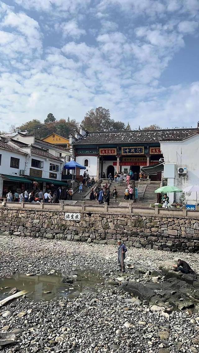 寺庙两旁是一家挨著一家的小商铺,门前的月牙池据说是地藏的放生池,白墙黑瓦的寺庙和商铺倒映在池子里,能拍出漂亮的照片。月牙池附近有一娘娘塔,僅剩塔基,据說是为紀念金地藏的母亲而建。