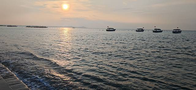万尾金滩的落日,晚上到天下客海鲜店吃海鲜