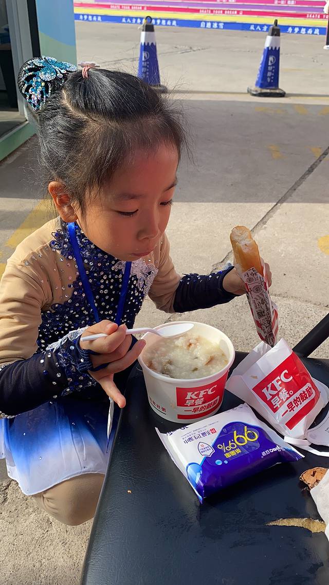 放下行李我们就去考级冰场,在冰场点的外卖快10点了才吃的早餐,而且连个桌子都没有,正好门口看院的阿姨给我们一个小椅子,就拿着当桌子吃的早饭。这么小的一只就要承受一般小朋友都没经历的事,也不知道是好事还是苦了孩子。