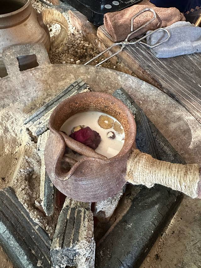 守着围炉,看老板生火,现烤一杯玫瑰奶茶。