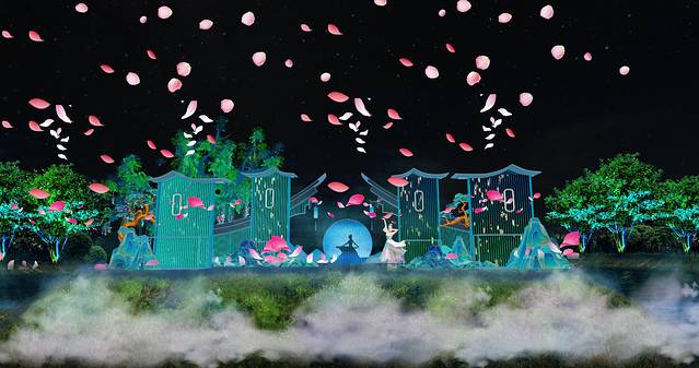是一个户外行进式夜游产品,包括陆行和水行两条动线。陆行动线结合双IP角色(鹤小淇、鹤小沬)梦游玄境的故事展开在东门和北门广场,后续行进过程中,游客还可感受幻光森林灯光艺术小品,互动光影装置等丰富多彩的夜游内容。水行动线则是以观澜码头为出发点演艺岛为终点,打造而成的水上漫游式夜游产品。