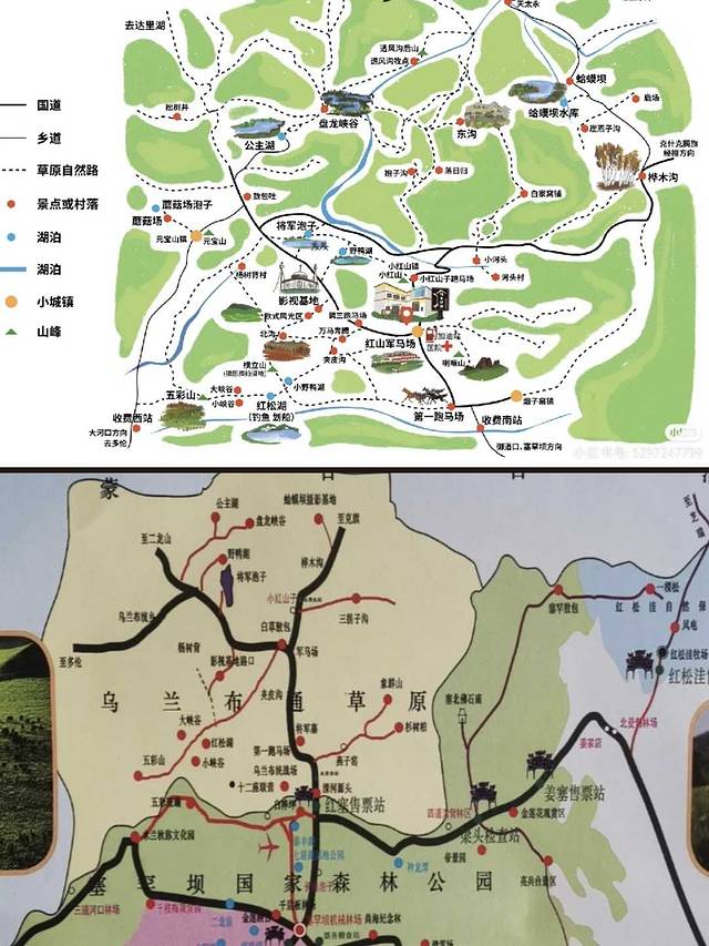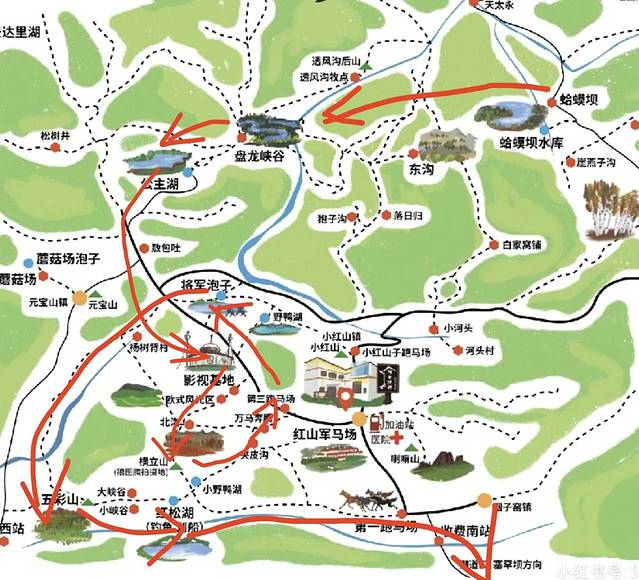 因为蛤蟆坝在 乌兰布统 东北 角,盘龙峡谷和公主湖同样在 乌兰布统 北侧,所以我们想第一天先杀到最北边自东向西游玩北半部分景点,夜宿 乌兰布统 南侧正好方便第二天游玩然后第三天就顺便南下回家了