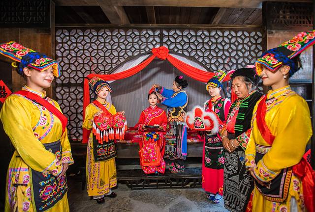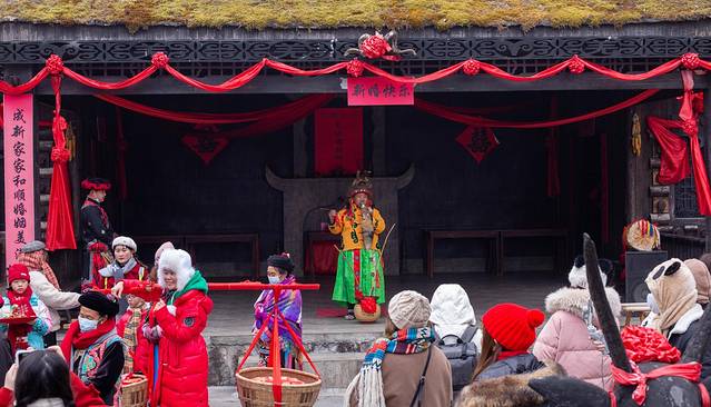 我们沿着尔玛古道一路走去,在神树林许愿,在天神殿看秋色的红黄树叶,在羌情园看一场羌族婚礼,赶到羌情园的时候已经是中午时分了,我们刚巧赶上了这场婚礼的举行,只见得新郎为了求娶新娘,过五关斩六将一路闯关见到了自己的新娘,在羌族德高望重的释比老人的祝福下,带着新娘回到男方家拜堂。