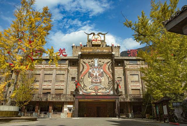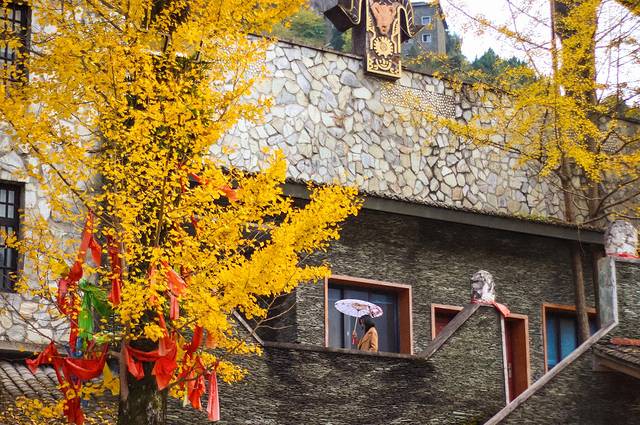 随着缆车到站,便是在半山腰的样子,入眼便是一个大广场,有着浓郁的少数民族气息,羌族的碉楼建筑,大大的篝火堆,羌式的酒店都有着浓郁的羌族味道。但广场上的银杏成为了这里的秋色聚集地,金黄的叶子随风摇曳,点缀着这个羌式的广场。