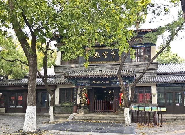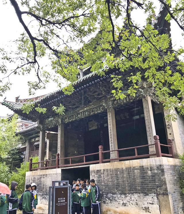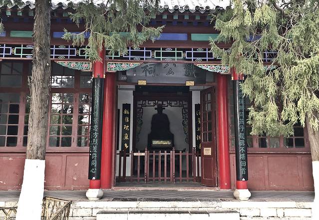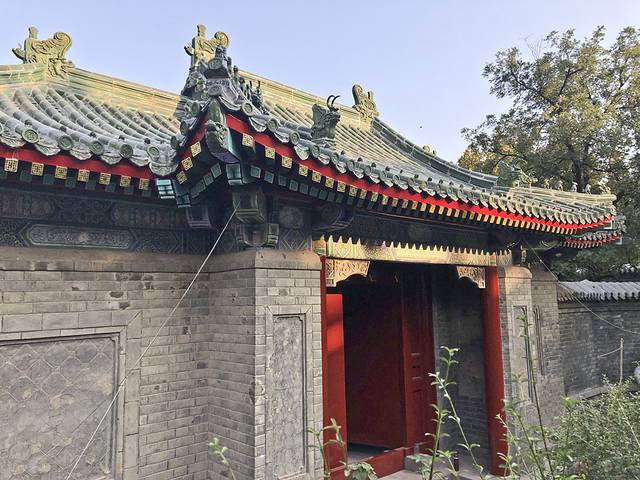 院子几乎被两棵枝繁叶茂的古树遮满,正中是关帝大殿,可惜在修外观,档布严重影响欣赏。门前石柱的浮雕极为精美。由于雨天,里面除供台外没有灯光,黑乎乎的大殿看不清特点,模糊中感觉也是相当气派。