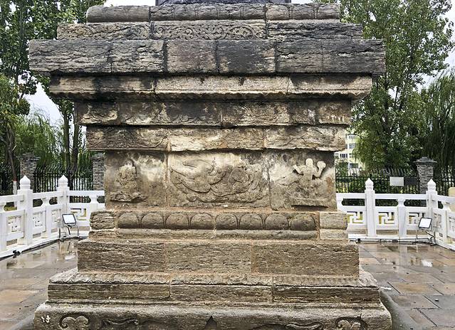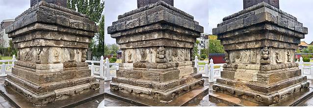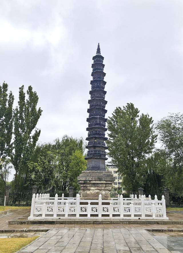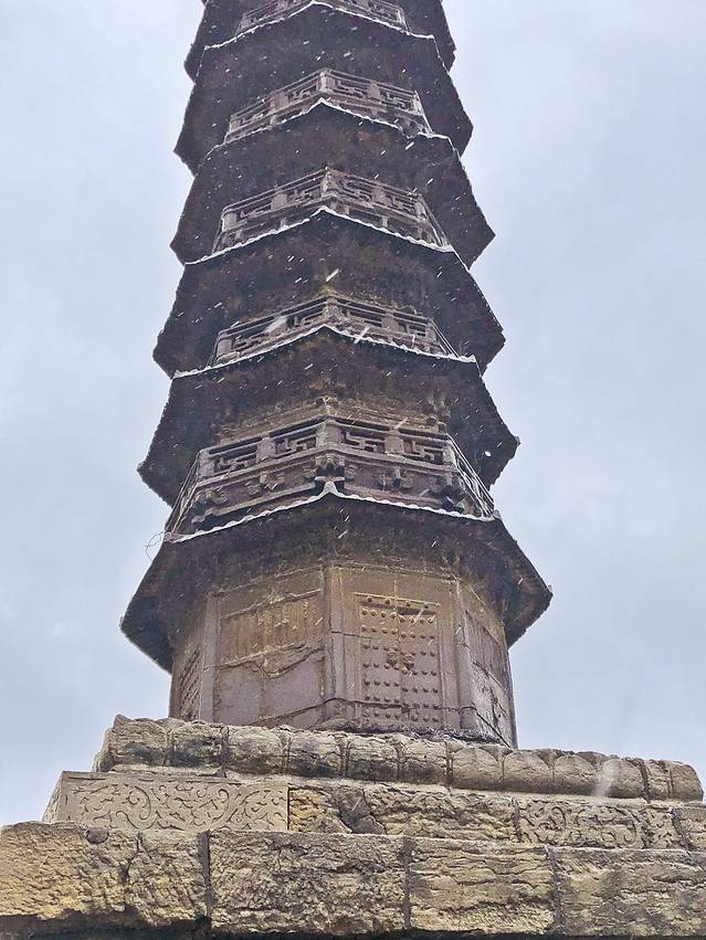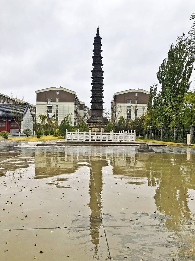 进到院内细细欣赏,整体保存完整,塔座腰部浮雕力士、龙凤、鸟兽和乐舞人物等精美图案精美。塔身生铁的仿木造型也是生动不俗。湿湿的地面倒映着她长长的倒影,空无一人的院子中,只有我静静地看着她,不知这近千年文物可有灵性感知到?