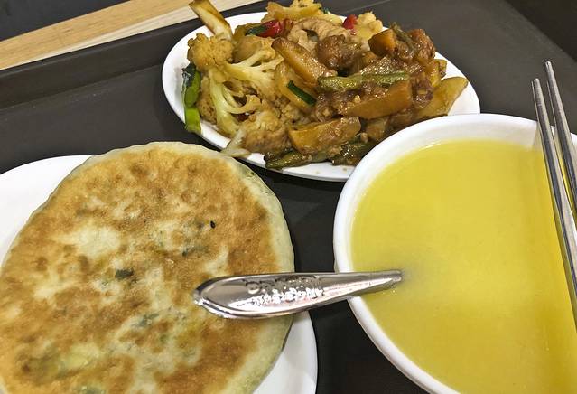 下班时间电动车很多,我骑得有点战战兢兢,好在不远,不到2公里就到了。还是“李老师快餐”,一个馅饼、一盘菜还让服务员拼了2种,喝了2小碗免费玉米粥,才8元,却是很舒服,非常适合我的口味。济南这几家快餐店都有这样的免费粥,很不错。