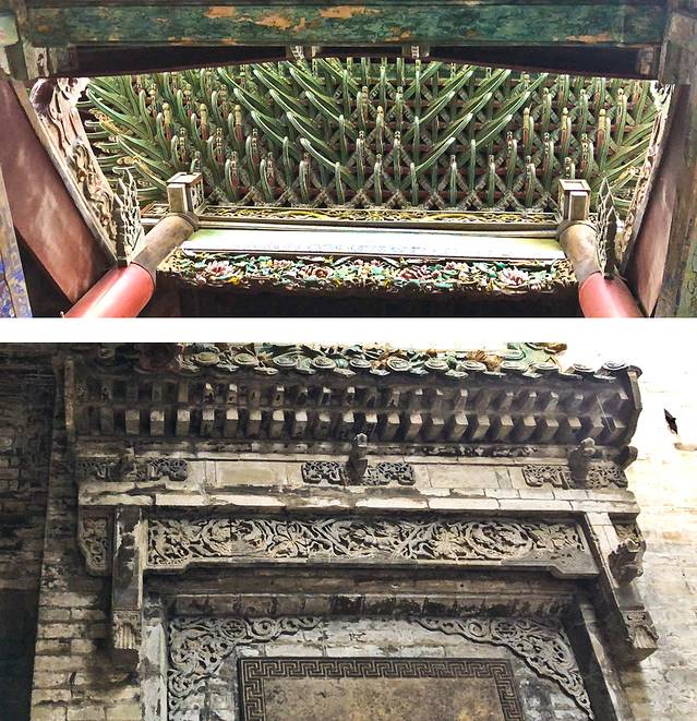 入口处为砖雕垂花门罩。罩上方有石刻匾额“岑楼凝霞”四字。甬道左右各有一个石刻照壁,左刻丹顶鹤与苍松,右刻梅花鹿及花草。同正面一样,一层层的装饰斗拱加上飞桅翅角,那叫一个眼花缭乱。看着眩,真不知当年的匠人是怎么设计和建造的?真正的建筑大师和艺术家呀!