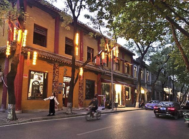 回酒店休息了一小时,4:30又骑小车到经三路和大观园看看。“要想寻找老济南的风貌就来经三路”,果然不宽的街道两侧许多老房屋,一些还是榜上有名的,天渐渐黑了下来,也累了,就没再多走,感受一下老济南当年的样子也是不虚此行了。
