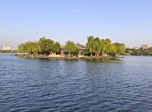 从稼轩祠码头乘船,先到历下亭所在的小岛,玩儿一会可乘船返回,也可去铁公祠,然后从西南门出去。今天时间富余,便在历下亭小岛上慢慢走走,不大的小岛一会就看完了,又坐了一会儿,到码头去铁公祠的船刚走。