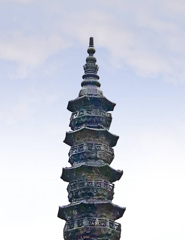 吃完步行有400米就到了铁塔,是聊城最古老的古迹,建于北宋早年。细高造型的铁塔为八角形楼阁式佛塔,现为12层,塔高15.8米,由塔身、塔座两部分组成,塔座为石砌,塔身用生铁仿木构分层铸造。各层都有腰檐平座,腰檐仿木檐铸造有檩枋、檐椽、飞椽、瓦垄及斜脊等。塔身逐层收分,塔顶置仰莲葫芦宝瓶式塔刹。第六批全国重点文物保护单位。