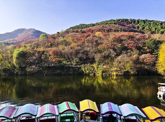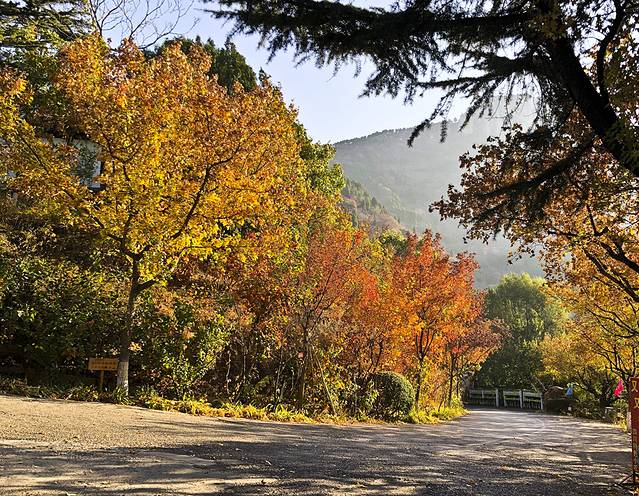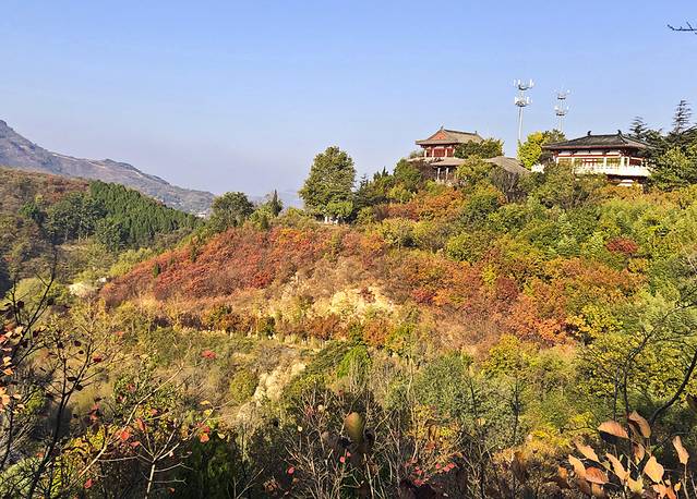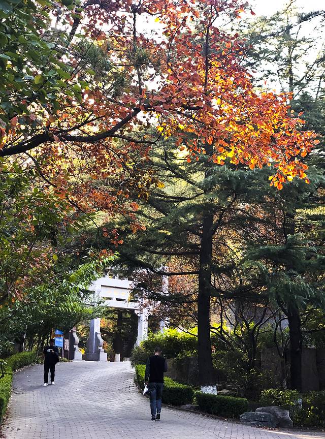 行前认真查了资料,想赶上红叶谷的最佳时间,可怎么也没查到具体观赏时间,所有官方和个人的文章中都是含乎的10月中至11月中,要么就是周六周日等,这根本就不算消息。赏红叶同赏花,最佳时间只有一周左右。没办法只好对比北京时间来估计,济南气温比北京约高2-3度,北京市内红叶时间是在10月底到11月初,那么济南红叶谷不会早于这个哟。就决定10月24日出发,可查了几天后又推迟了2天。10月26日才出发,行程是潍坊-青州-淄博-济南-聊城。29日才到济南,还先玩了两天其它景点,直到11月2日才去游红叶谷,结果叶子都掉一多半儿了。想想真是可笑,我26日出发的时间就已经叶子红过时了些,我又先游其它,就是到了济南都没马上去。不知怎么估算差了这么多?回来查了树的品种,同香山一样以黄栌为主,不知为何会比北京早10天红,且气温还比北京高?唉,真是不知所谓了。在此看见我游记的亲请记住:济南红叶谷的红叶一般是每年的10月15日到10月底,最佳时间应该是20日-27日这一周,今年天气还比较热就是这样,否则时间会更早些。