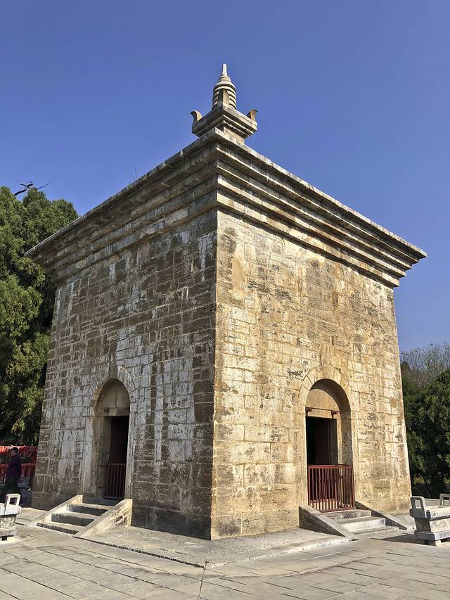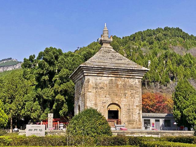 上了一小段台阶就见到了四门塔,简洁古朴,造型独特,阳光下静静竖立于小广场中。塔身通体由巨大的青石砌成,单层,正方形,四面各开辟一个拱门,故而俗称“四门塔”。于隋大业七年(611年)建成,已有1400多年历史。