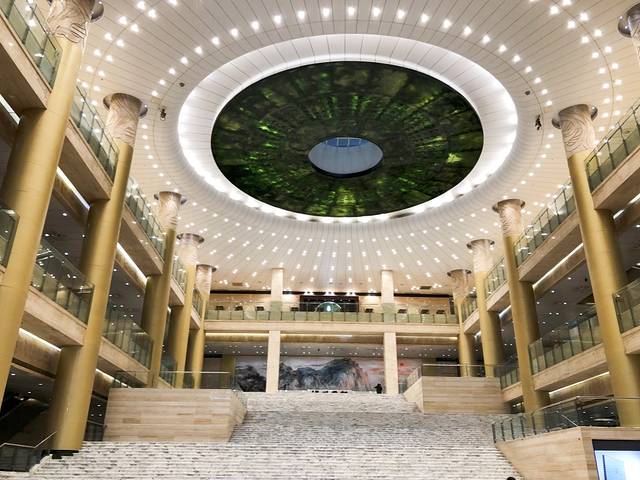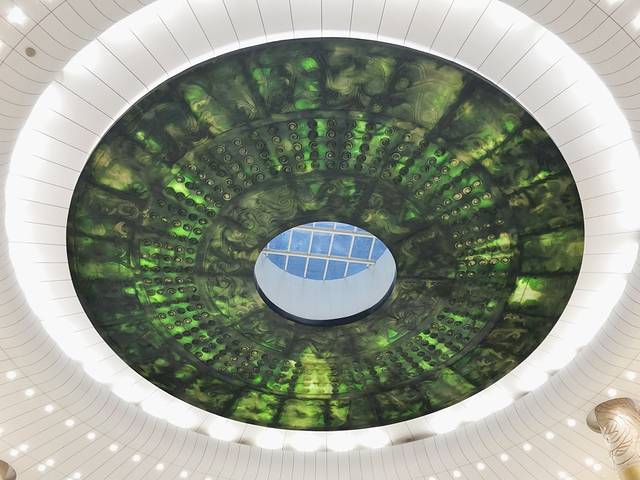 走入大堂,抬头见那圆型穹顶是以曲阜鲁国出土的大玉璧为灵感设计,它是国内至今为止发现的最大玉璧。站在大堂中倒是可以清楚的感受到天圆地方理念。