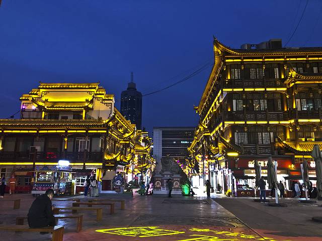 穿过一个小公园不远就是大观园,一条仿古街不长,中间一条设有刚才经三路附近的济南老建筑照片,有几个正是刚才看到的。一会儿灯光亮起也是不错,坐在小广场上休息欣赏了一会儿,结束骑小车回酒店。