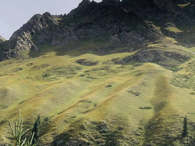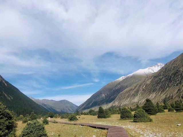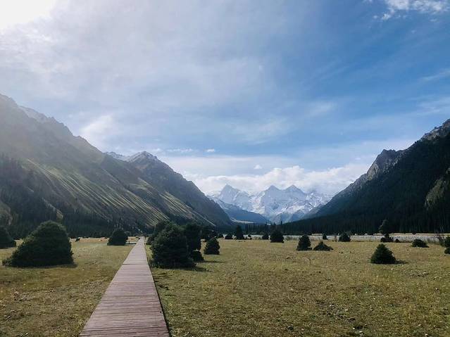 山谷的尽头就是终年不化的木扎尔特冰川,也是让夏塔区别于伊犁其他景区的灵魂所在。冰川在阳光下白到发光,美得如天山仙女。最妙的是,近日的阴雨让四周的山峰全都积了薄薄一层雪,刚好今日云雨收敛了,晨辉从山谷后面照出来,撒到雪顶、草地上,给本就美丽的山体披了一层金色薄绒。向阳的山坡褶皱更是露出绸缎般的光泽,整个山谷就像一幅巨型油画。