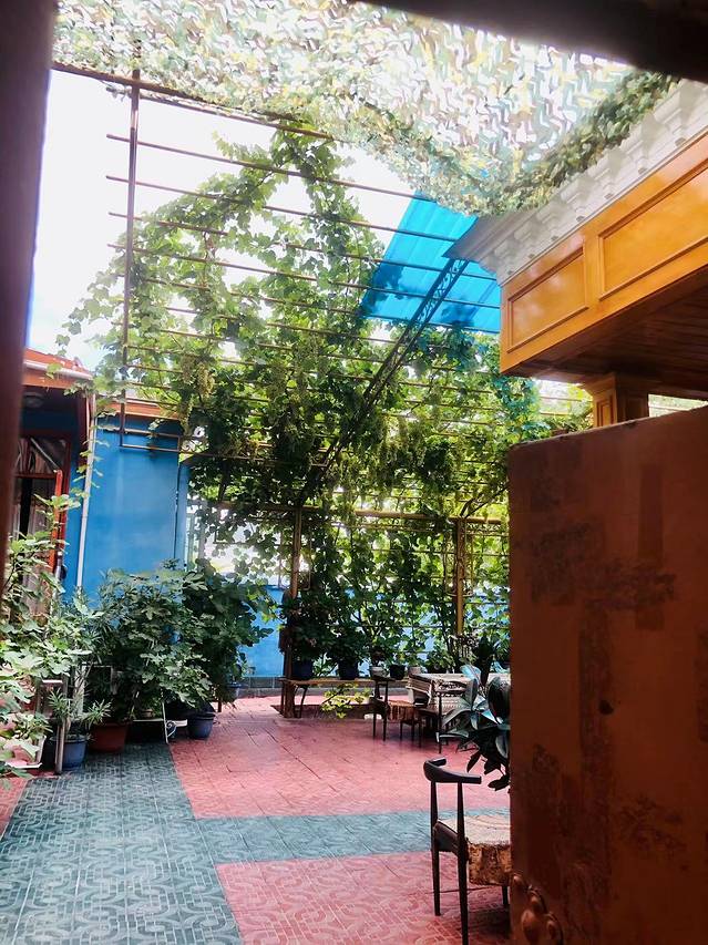 每条巷子里都住满人家,他们精心维护着自己的家,门外种树栽花,院内坐榻饮茶。爱美似乎刻在了他们的基因里。屋内屋外多有绿植装扮,院内铺着繁复美丽地特色花纹砖,榻上还铺着漂亮的毯子。案几上的茶壶杯子不乏岁月感,但难掩其精致。