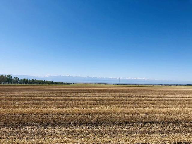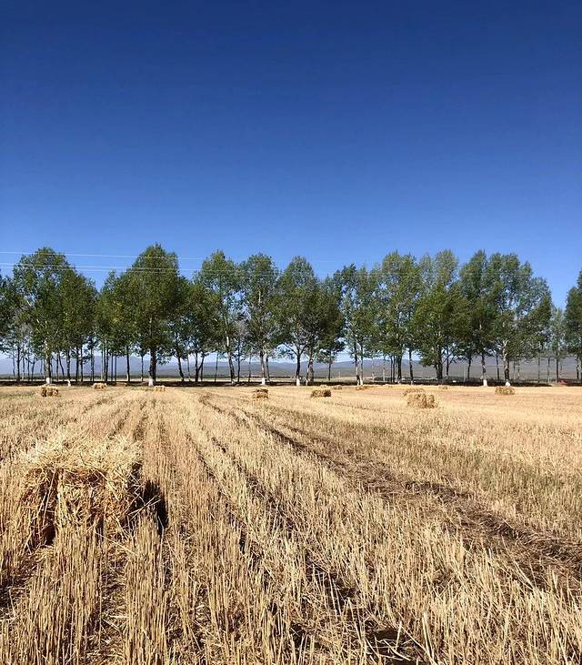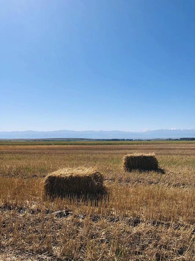 返回昭苏城后,天气豁然开朗。昭苏县城不大,走一走就能到城郊,笔直的马路似乎通往雪山,道旁就是金色的麦田,堆着麦垛。蓝蓝的天,空旷的路,骑上共享单车,非常适合在田边发疯。