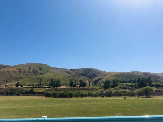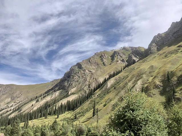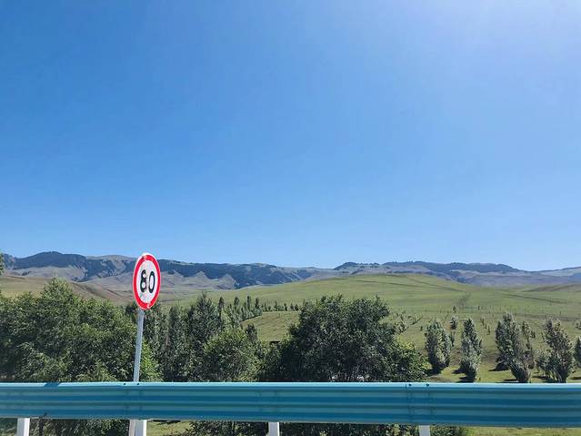刚开始窗外还很普通,从那拉提乡开始,景色突然变了,风光大道正式登场~连绵的绿色曲线在眼前展开,微蓝的天空跟幕布一样。朋友激动得要下车躺几日,最后被同车小伙伴劝住了才作罢。