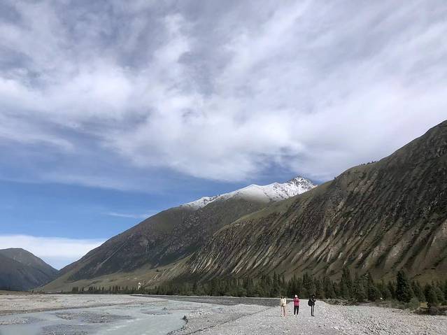 一条宽阔的河流哗啦啦流过,目之所及都是被流水刷得圆圆的石头。河水来自冰川雪水,自高处来,自是势不可挡,在巍峨的山峰之间硬生生冲刷出一片开阔谷地。