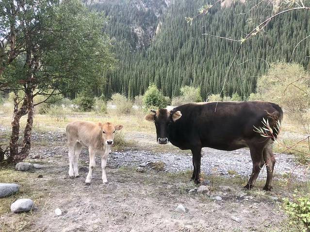 路边的小牛也在散发萌力。不像牧场草原,牛羊动辄绵延数里,夏塔河谷的容纳力有限,山谷只散落着一二十头牛,这让整片区域显得更加美丽宜人。有好多稚嫩的小牛仔仔,瞪着大眼睛蛊惑你去摸摸它,但是一走近他却娇羞地躲开了,你越追,它越躲,最只能隔着几米拍拍照了,哎~