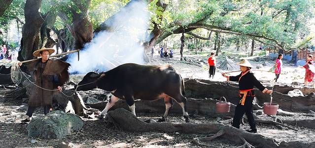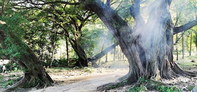 这个榕树群由多棵巨大的榕树组成,其中最大的一棵为先民在南宋理学家朱熹指点下种植的风水树,至今约800多年。小棵是咸丰年间补种,至今也有100多年。这片榕树位于北纬27℃,为全球纬度最北的古榕群。古榕盘根错节、绞杀包容,形成了一片茂密的林地,已经分不出具体由几棵树组成的了。