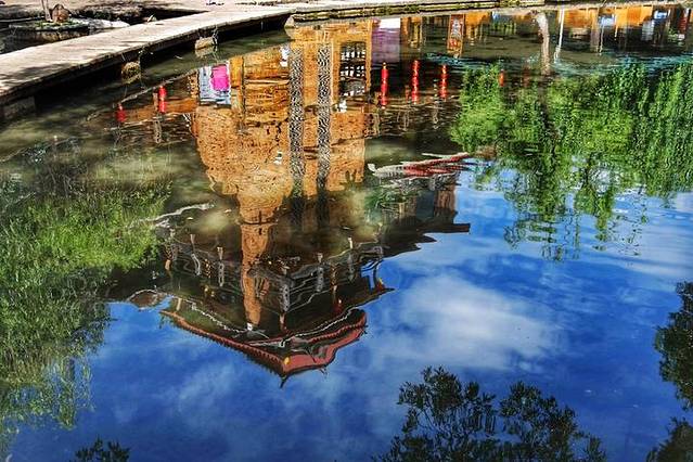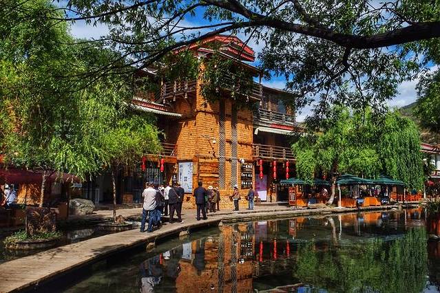 古镇最繁华的地方是一片不大的池塘, 周边布满了餐馆和酒吧,潭水清澈见底,据说束河古镇的水是玉龙雪山上的雪水化了以后流下来的,所以这里的流水是丽江最清澈的。