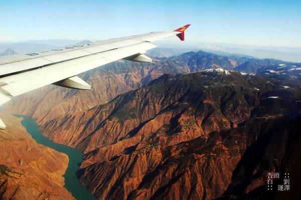 偶尔的气流颠簸把我从瞌睡中摇醒,舷窗外的景色也不时的让我惊叹。偶然间我发现右后方有另外一架飞机,小小的一只。不断向西南飞行,天空也越来越明朗,能见度也越来越高,我甚至可以看到远方高耸入云的雪山,峡谷山坡上的村落和碧绿如玉的金沙江。飞机换换下降高度,在丽江上空盘旋,玉龙雪山威仪的显现在窗外,不得不说很多景色只适合宏观,就像那千古名句“不识庐山真面目,只缘身在此山中”啊。