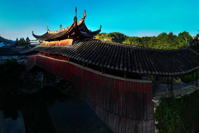 航拍注意事项:1、超低空拍摄时请注意河面与树枝;2、远离廊桥百米外安全拍摄为最佳。