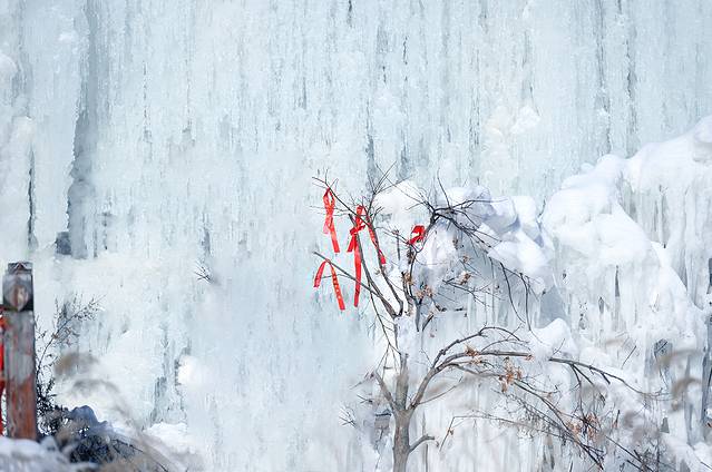 飞流直下的冰瀑群,在我眼里就宛若一个巨型的“冰雕”,阳光下还会呈现出淡淡的蓝绿色,超级美!