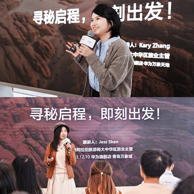 华为旗舰店·青岛万象城站特邀旅寻家@超级小包总、@迷途的小柒。作为亲身莅临沙特的旅行家,@超级小包总分享了自驾沙特4000公里的奇妙旅程,红海潜水、德拉伊耶古城漫步、水上清真寺观日落、骑着白骆驼穿越红色沙漠等,一路见证了许许多多大自然奇迹和异域特色人文。@迷途的小柒打卡了世界文化遗产名录之一的Hegra遗址,去穿梭时空感受沉睡的千年文明;在“沙漠镜子”Maraya音乐厅凝视流动的艺术品,享受自然与人文同辉。他们切身体验的分享引发现场观众纷纷种草。