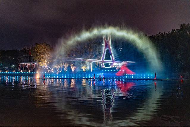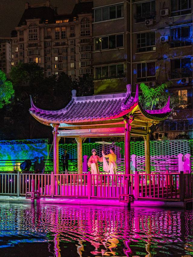 城市记忆主题行进式夜游演出——《塘河夜画》,结合繁华城市的风貌,让繁华与意境相融。光影交错中,舞者们以塘河千年的民间传说和诗词歌赋为主轴,演绎流光溢彩的塘河人文故事,通过讲述“郭璞筑城”、“韦庸治水”、“温州人闯世界”等一个个关于温州人奋斗拼搏的小故事,古今交汇,传达瓯越千百年来塘河儿女奋斗拼搏、眷恋家乡的情感。
