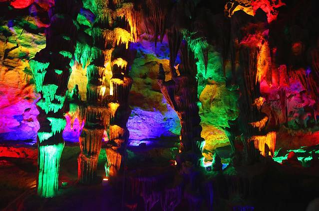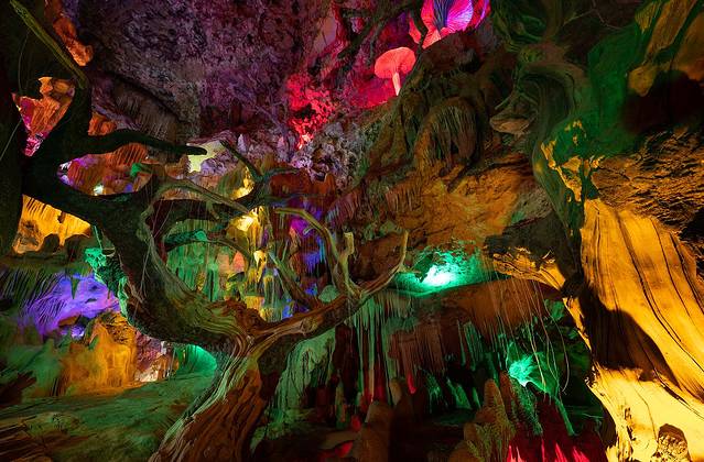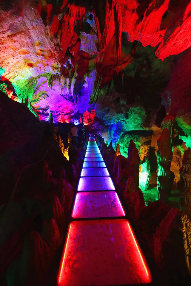 洞内原本是不见光的,但为了增加游览氛围,还特别设置了各种绚烂的彩灯,这样看着就有种奇幻的感觉了。