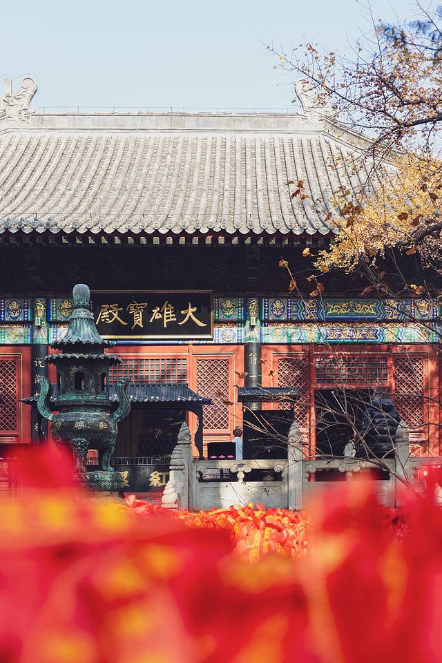 清风吹拂过耳畔,深秋的湛蓝天空让心情格外舒爽,红螺寺的大雄宝殿前,有两棵珍贵的古银杏树,一雄一雌,树龄都在1100年以上,雄树春天开花,秋天却不结果,雌树不开花,秋天却果实累累,被人们称为夫妻树,也被誉为“红螺寺三绝景”之一。