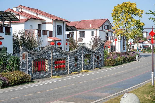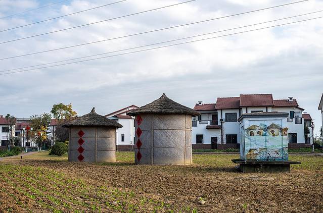 进到村子里面,入眼就是红瓦白墙的特色小楼房,有点像一幢幢小别墅,排列得非常整齐,有些房子上还画上了色彩艳丽的年画,很有特色呢。