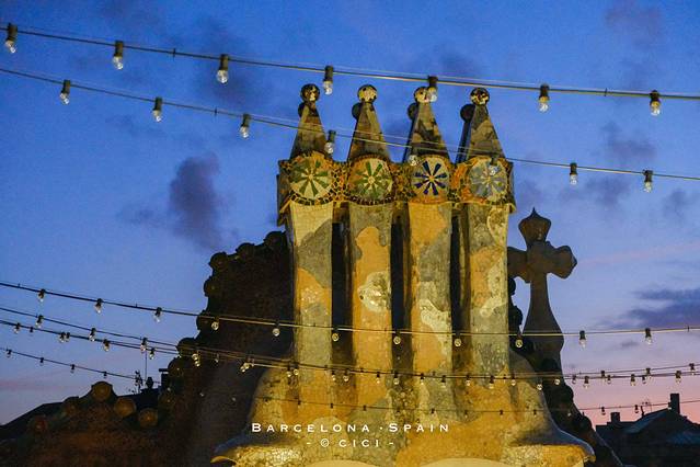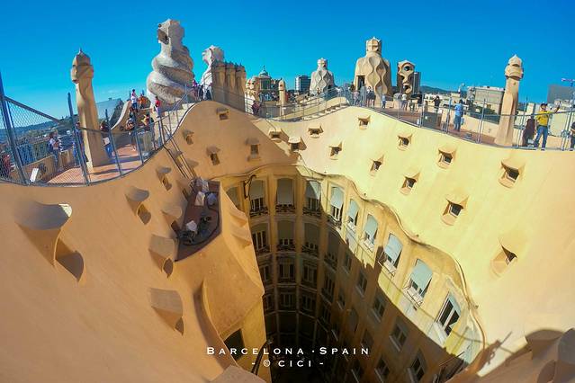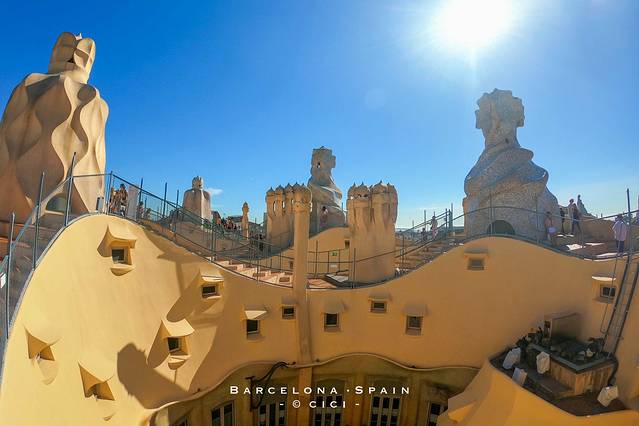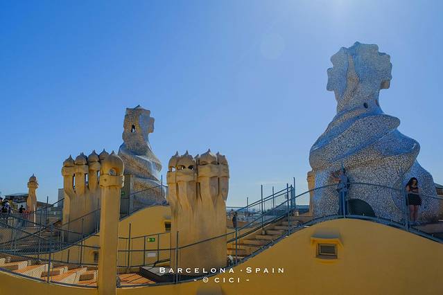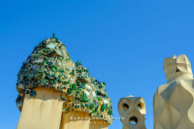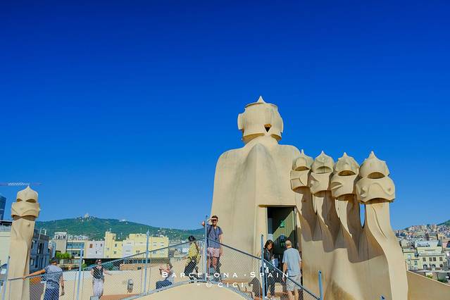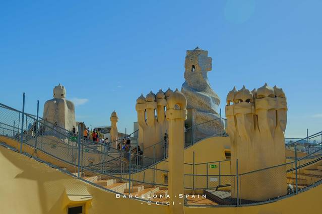 高迪融合俏皮造型及巧妙功能的天分充分体现在屋顶露台。高低错落的一束束烟囱展示楼梯井和通风塔,它们伫立于大楼如波浪般外形的轮廓之上,极富动感,像一栋即将移动的建筑。