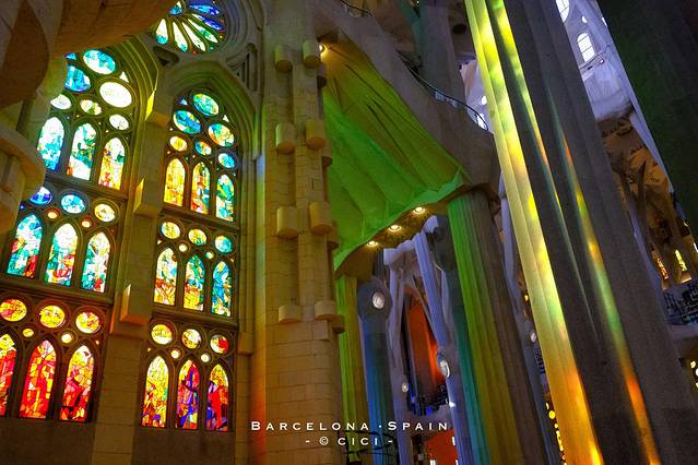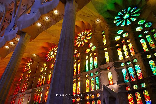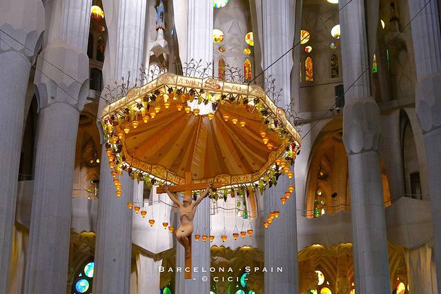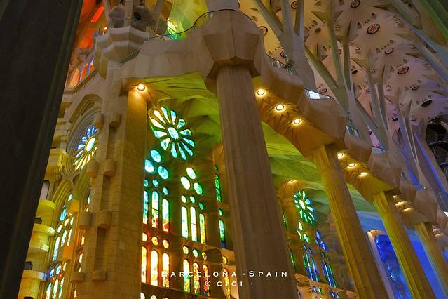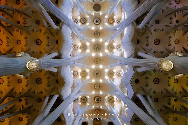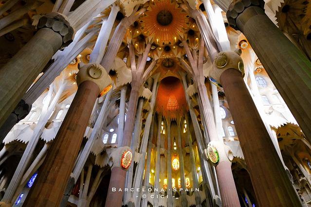 这座倾注了高迪满腔虔诚的圣殿无处不显示着这位天才的奇思妙想,大量采用宗教图像和象征的手法,对几何原理的娴熟运用、对自然元素的借鉴,对光线的掌控,令这座教堂显得超前而又独一无二,站在大厅中间仿佛置身于宇宙的中心,肃穆、壮观又处处流淌着建筑之美。