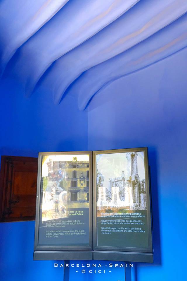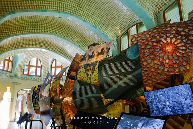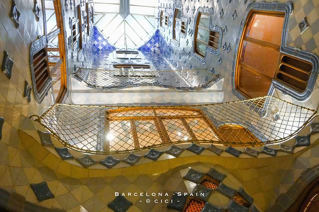 巴特罗之家的天井设计灵感来源于深海,为了制造温和的光差,高迪采用了15000块五种不同色调的蓝色瓷砖,越靠近建筑的顶层,瓷砖的颜色越深,仿佛正从波光粼粼的海面逐渐下沉潜入海底深渊。与其它楼层丰富多彩的装饰及设计形成对比,阁楼的墙面采用了纯白色调,以悬链式拱形结构为基本建筑架构,让人联想起鲸鱼的胸腔与肋骨,同时还具有整幢建筑的温度调节功能。